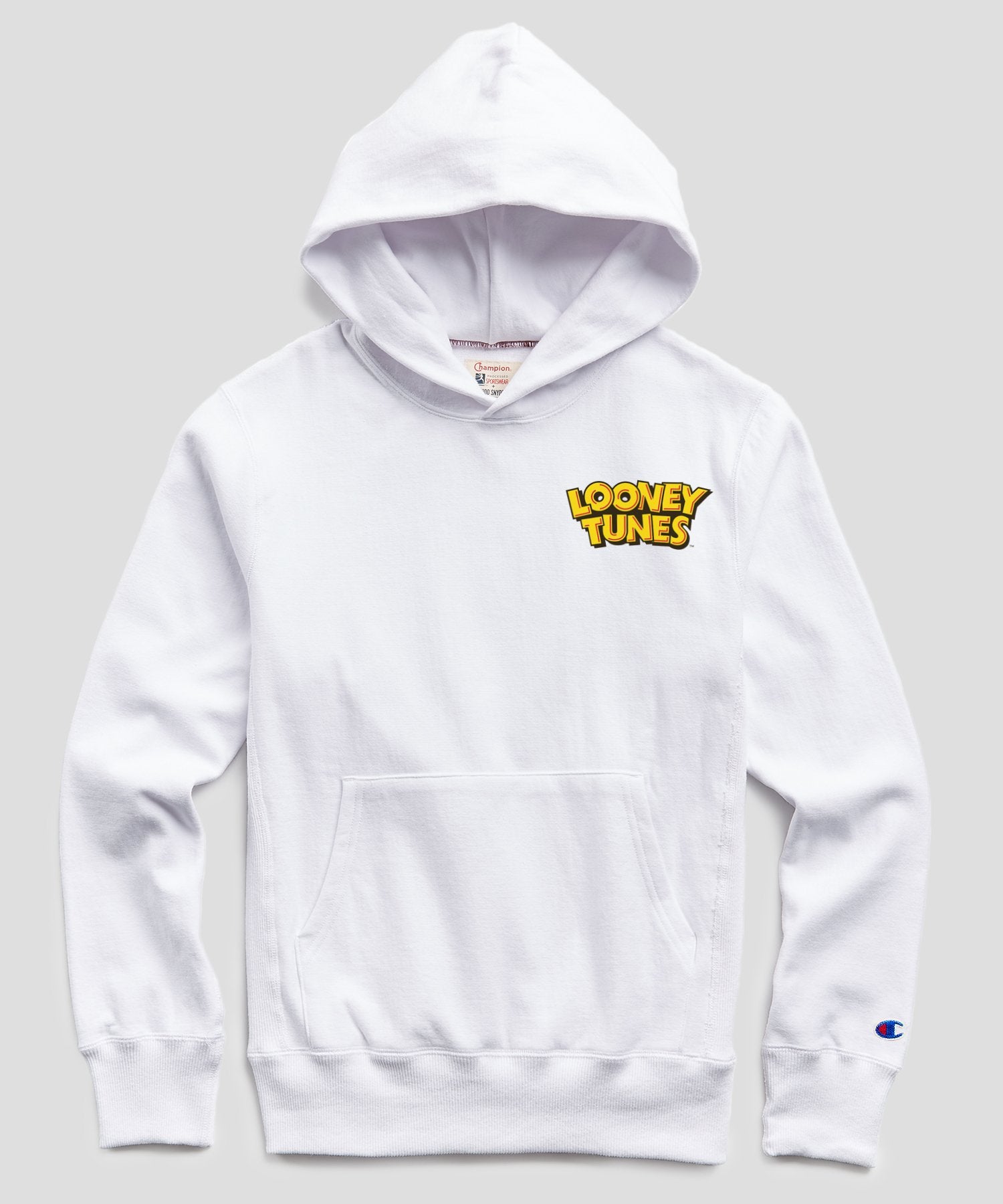 Our Champion All Tunes Graphic Hoodie cues to our classic from the archives and is warm and seriously comfortable made from softly structured 16 oz. fleece cut on the reverse weave. Inspired the ‘toons of our childhood it features the iconic Looney Tunes logo on the front with large graphic of all your favorite characters on the back—adding an elevated element of fun to your everyday basics. Features a double-layer hoodie for a sturdy weight and feel. Rib cuff and made in a family-owned factory in Toronto, and designed and manufactured by Todd Snyder.