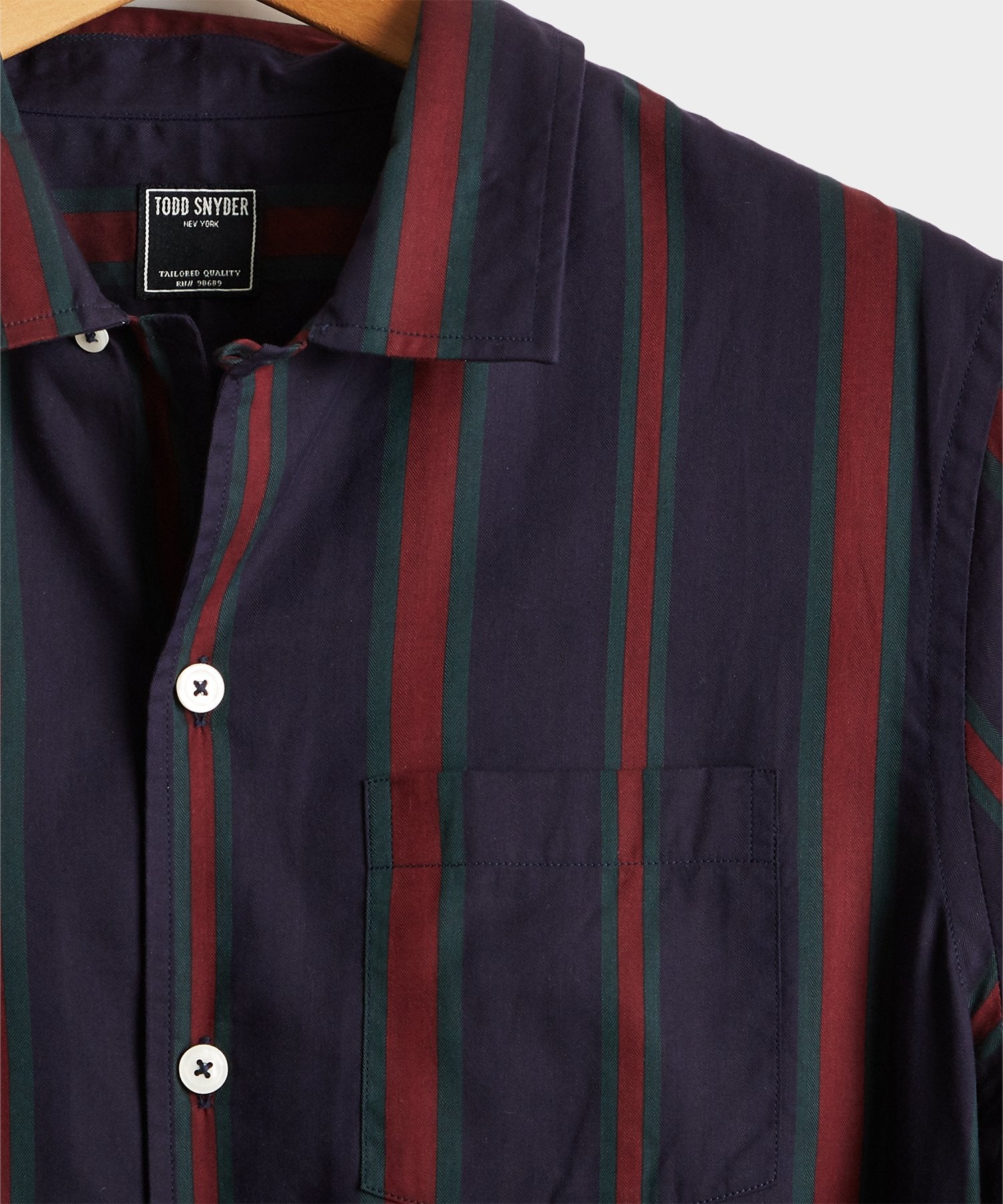 This playful shirt features our camp collar silhouette made with imported Japanese fabric. The design features a set in sleeve, and 70s inspired striping. The spread camp collar gives this shirt a stand out look.