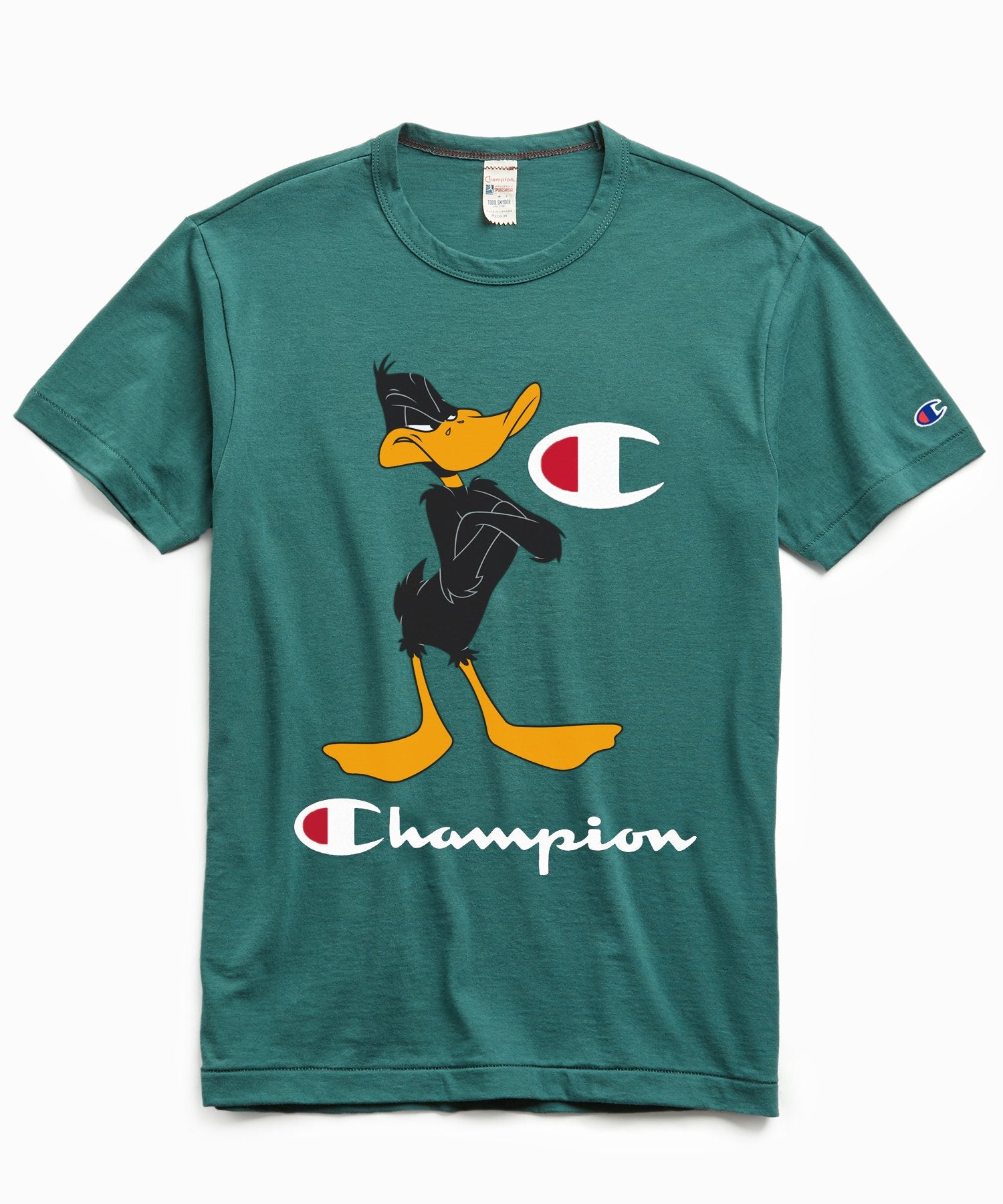 This classic tee is crafted from quality 100% Cotton in a family-owned factory in Toronto, using vintage flat-lock machines, and detailed with an epic throwback Daffy Duck graphic in collaboration with Champion. Fine details such as red cover stitching at the back of the neck, a self-fabric bound neck, and contrast sand-colored stitching elevate this humorous spin on an everyday basic. Our premium Champion knitwear is designed and manufactured exclusively by Todd Snyder.
